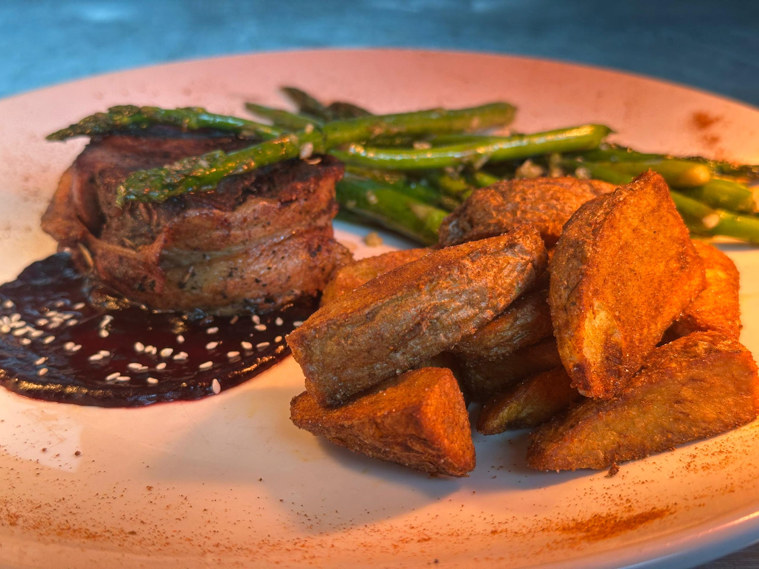 Para el lomito :Ya teniendo el corte del medallon de lomito, se especia y se envalda en tocineta luego se agrega Romero y se lleva a la plancha, al dar la vuelta se le agrega la sal y Pimienta Negra Molida McCormick, se retira de la plancha al estar ¾.
