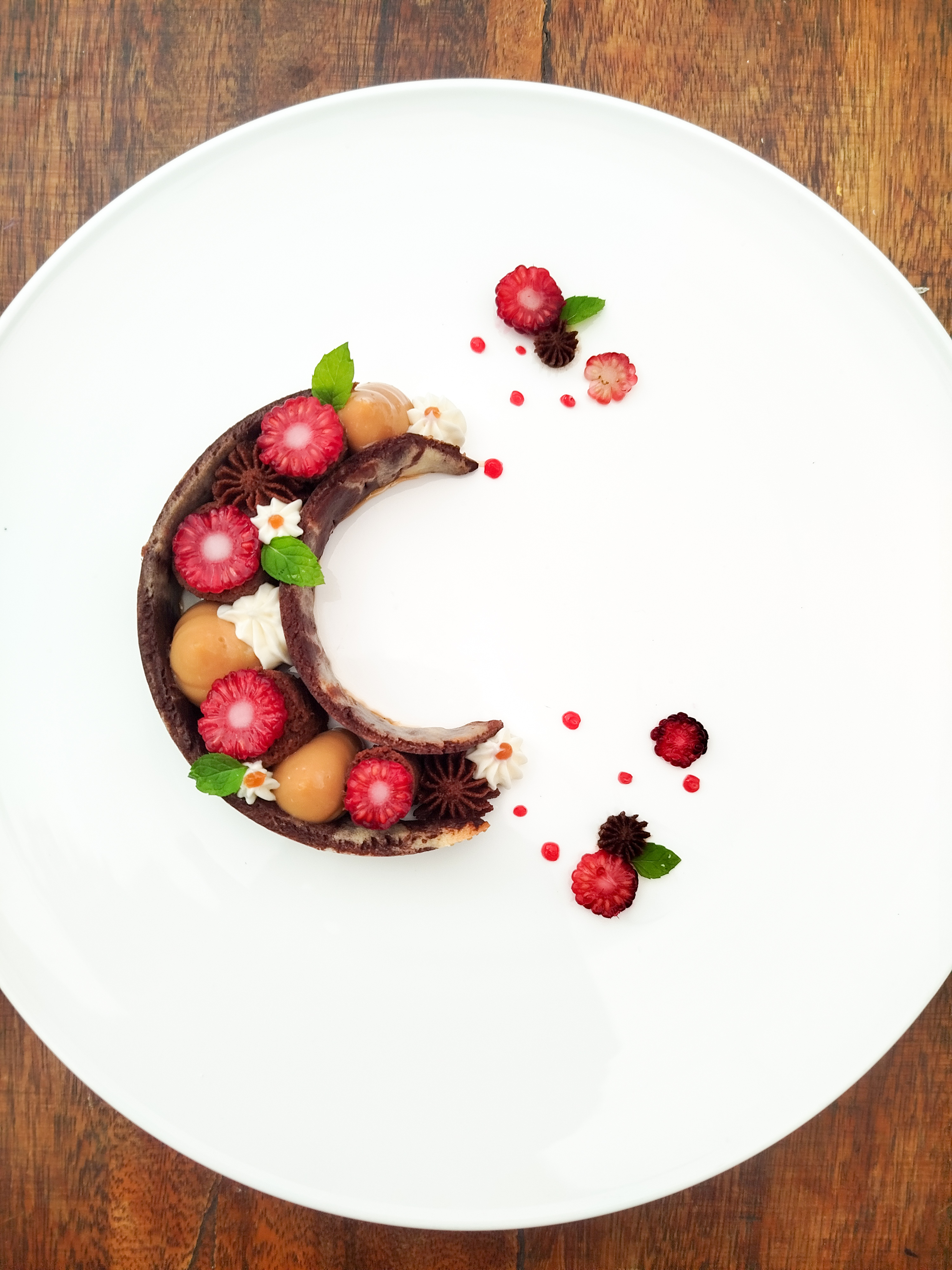 Para la masa Sucree:Cremar la mantequilla y el azúcar glass, incorporar el huevo, mezclar hasta homogenizar para luego añadir la harina y el cacao tamizado integrando sin amasar hasta formar una masa, llevar a refrigerar, luego estirar y cortar tiras para colocar en un aro de 14cm y en uno de 10cm solo hasta la mitad formando una media luna, llevar al horno por 10min a 180c