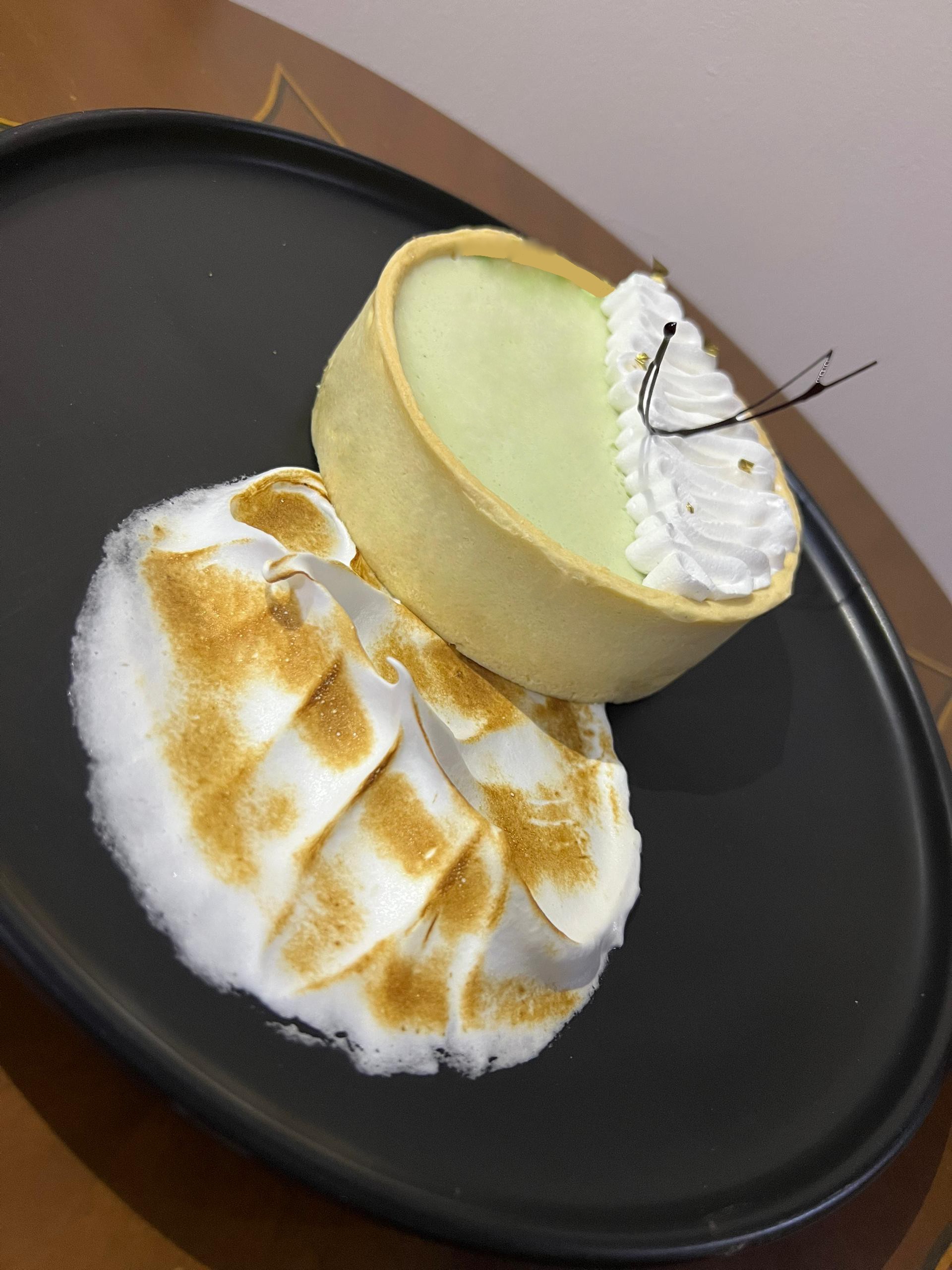 12) batimos la clara de huevo junto al azucar al punto letra y ponemos una cucharada en el plato que usaremos para servir y con un soplete de cocina gratinados el merengue, montamos nuestro chessecake y coronamos con una de las tiras de caramelo ya frias