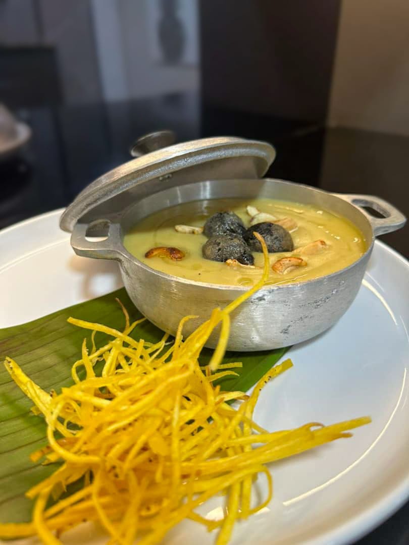 Pelar la batata y cocinar en abundante agua hasta que ablande , hacer un fondo oscuro con los huesos rojos , los vegetales y la salsa inglesa con vino tinto McCormick solo unas gotas ,en un procesador de alimentos o licuadora procesar la batata con el fondo oscuro y los vegetales que fueron usados para el fondo, agregar la leche de coco con un poco de Maizina Americana y cocinar a fuego lento , salpimentar, agregarle las especias y seguír cocinando por 10 minutos a fuego lento.Servir y a disfrutar....