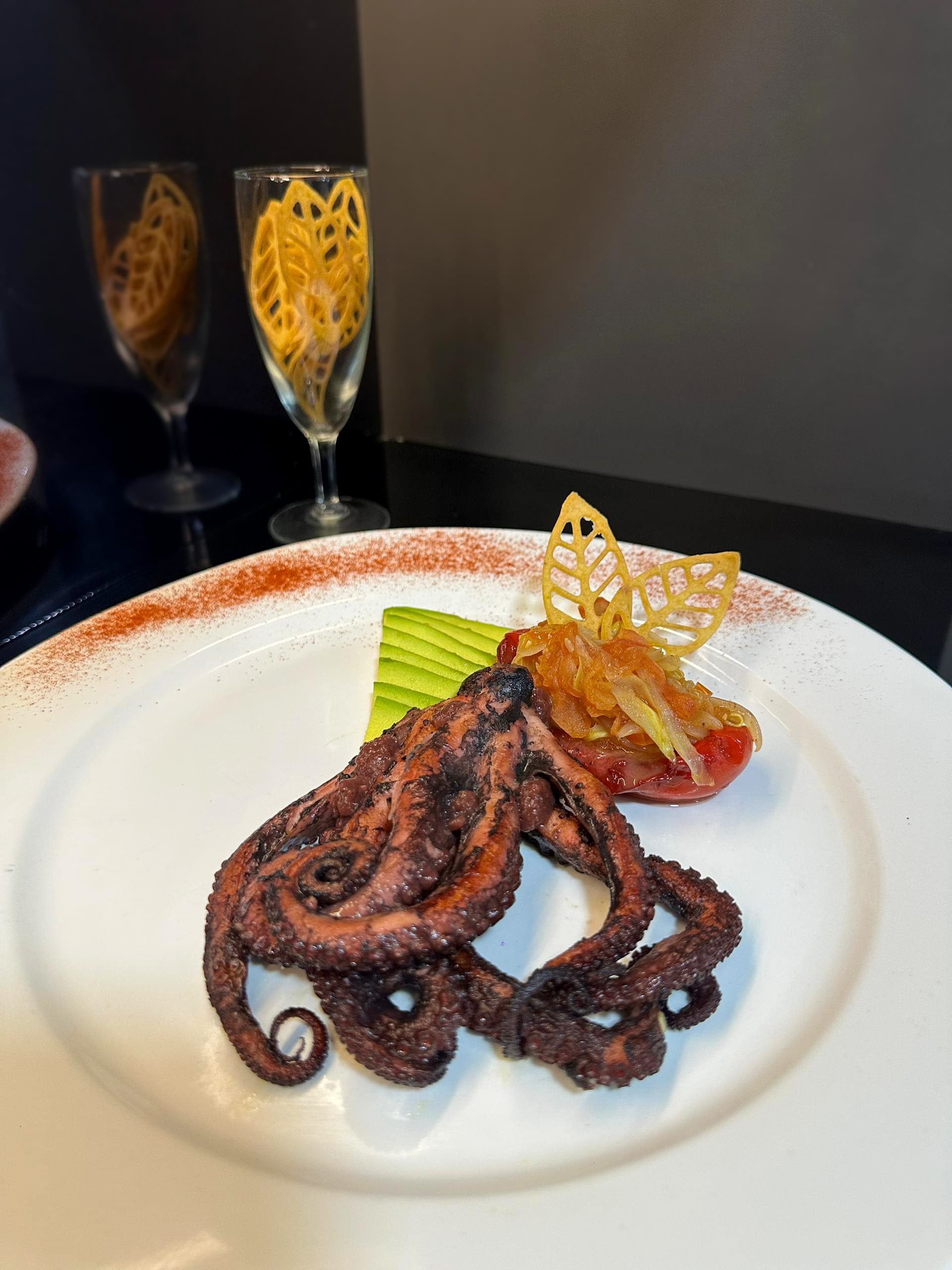 Para el emplatado agregamos un poco de nuestra salsa del pulpo como base colocamos el pulpo grillado, colocamos nuestra canasta de pimentón rellena con los vegetales salteados ,cortamos el aguacate y servimos y para culminar nuestro emplatado espolvoreamos con un poco de Pimentón Espanol McCormick.