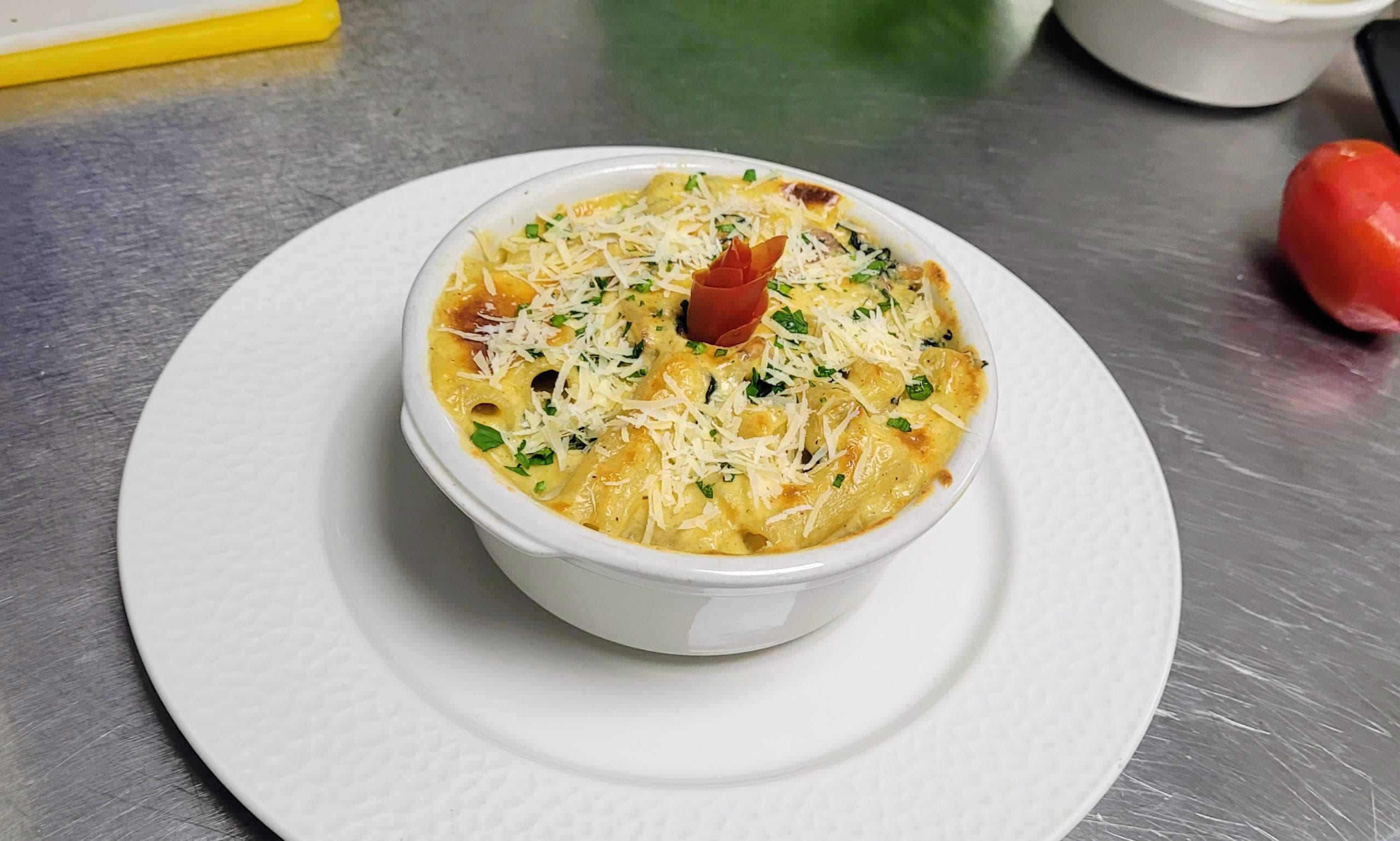 Macarrones con tocineta espinacas y salsa mornay