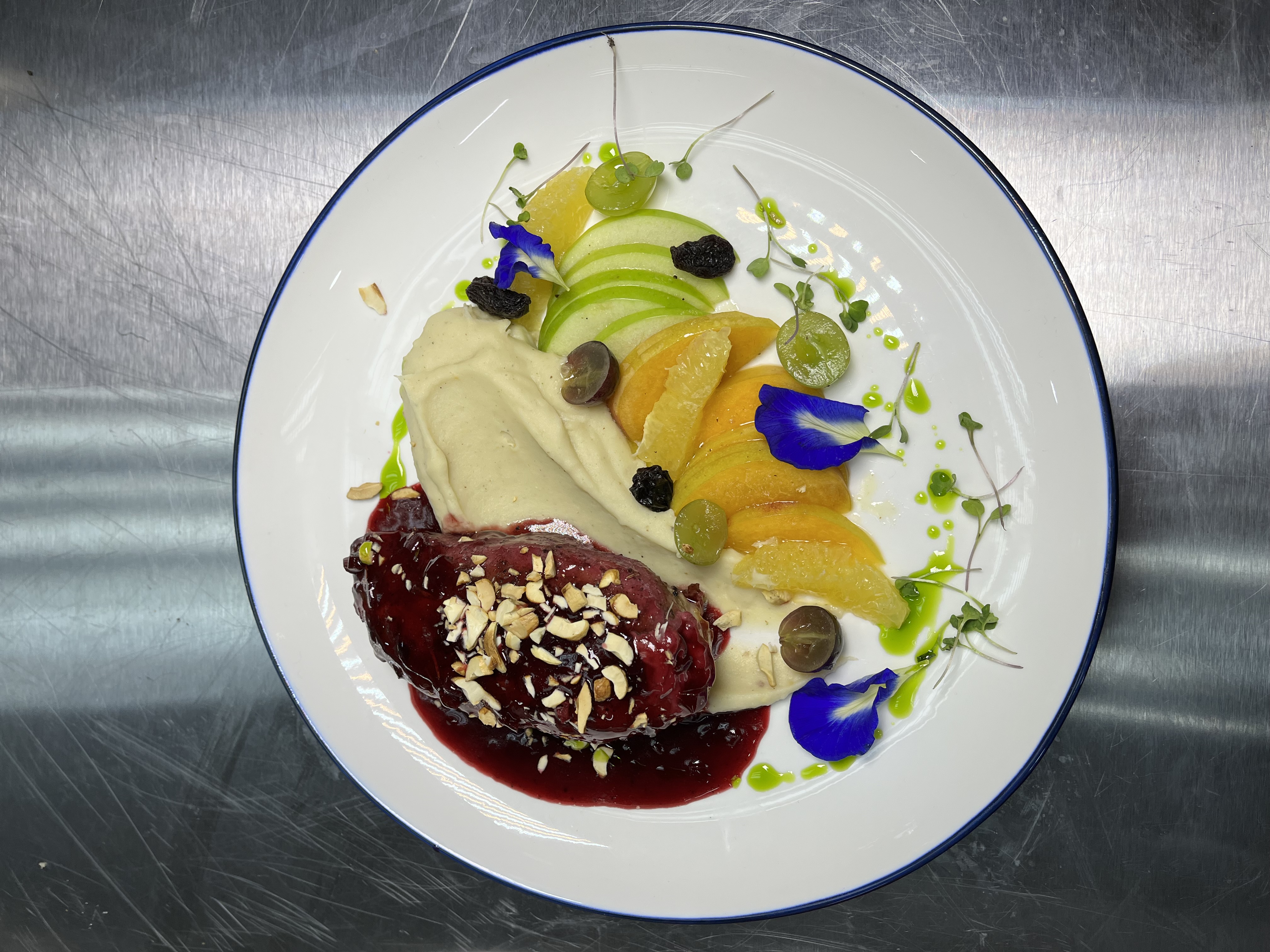 Para la salsa con la que naparemos la suprema se realiza una sangría desde 0, con frutas como naranja, uva verdes, manzanas verdes, durazno y flor de jamaica.
