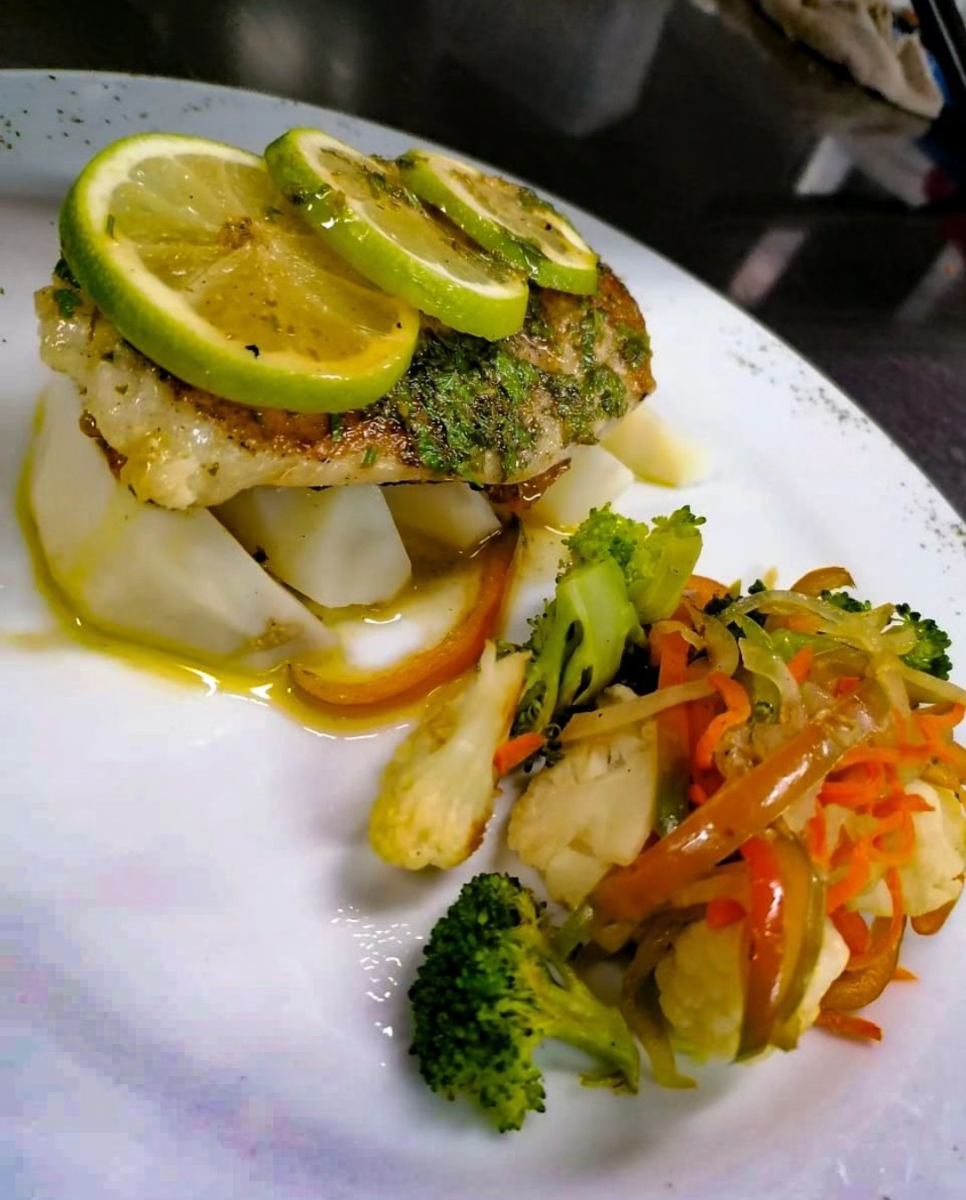 Colocamos las papas encima de ella nuestro pescado unas rodajas de limón, vertimos la nuestra reducción de vino y limón y a su costado los Vegetales salteado.