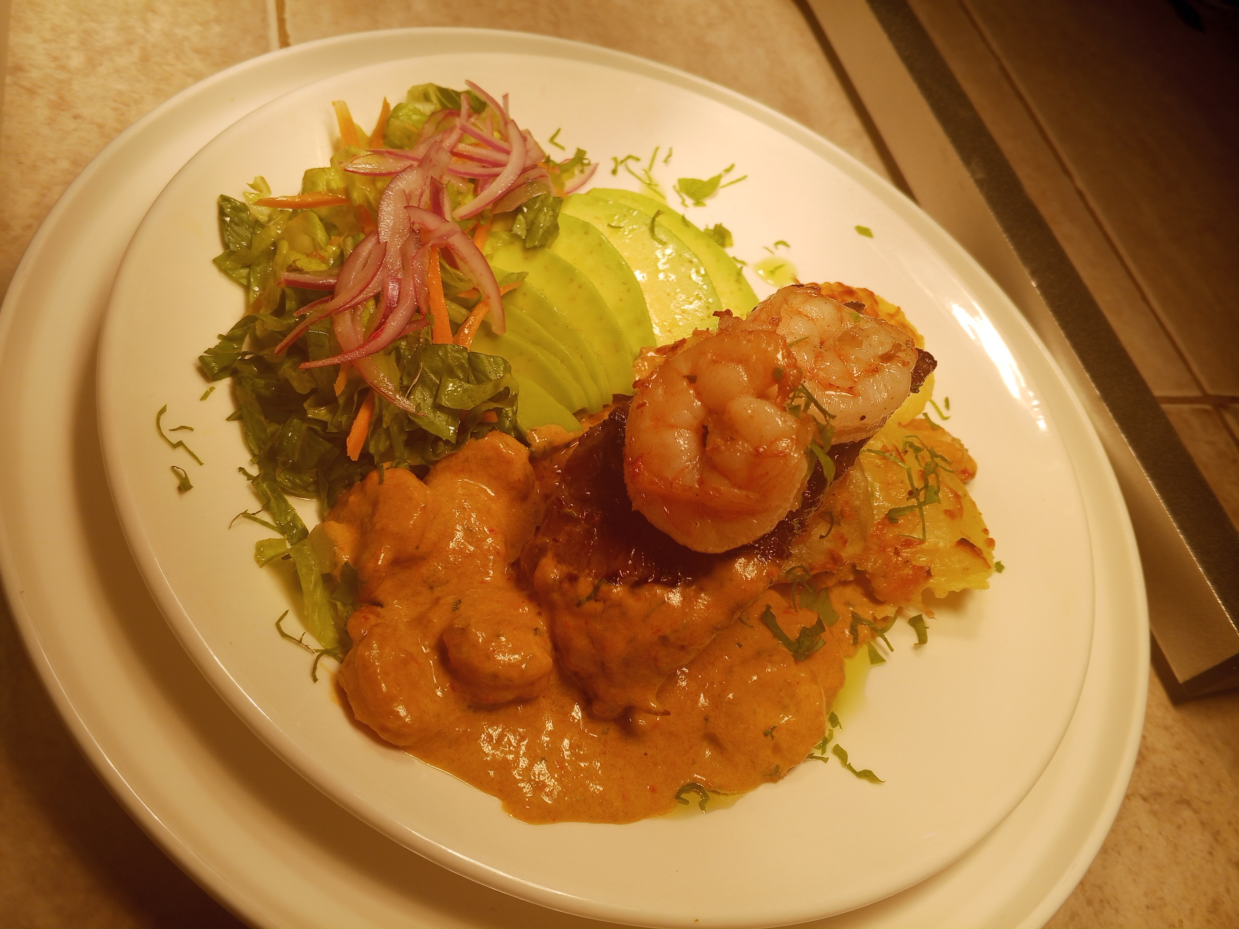 Lomito: Mar y Tierra en salsa Aurora de Camarón.
