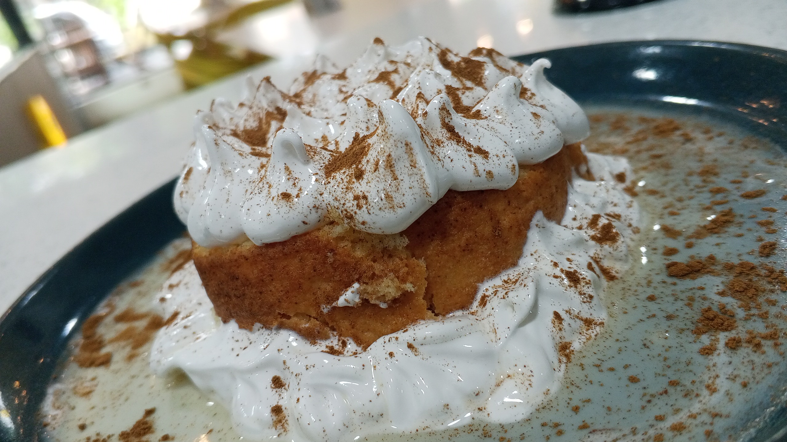 Cuando el biscocho esté frío colocamos el líquido, luego se decora con el merengue y se le agrega canela 10 gr de canela esparcida. Servir frío.