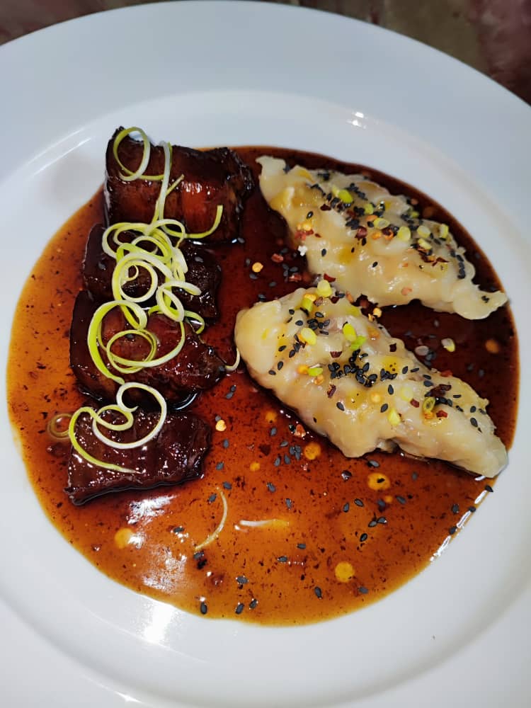 7 Ya pasado este tiempo removemos , destapamos , subimos un poco el fuego y agregamos un slorry ( 1 cucharada de Maizina americana y 1 cucharada de agua ) lo incorporamos a la preparación y esperamos que reduzca la salsa . debemos retirar las especias , y estará listo para emplatar.