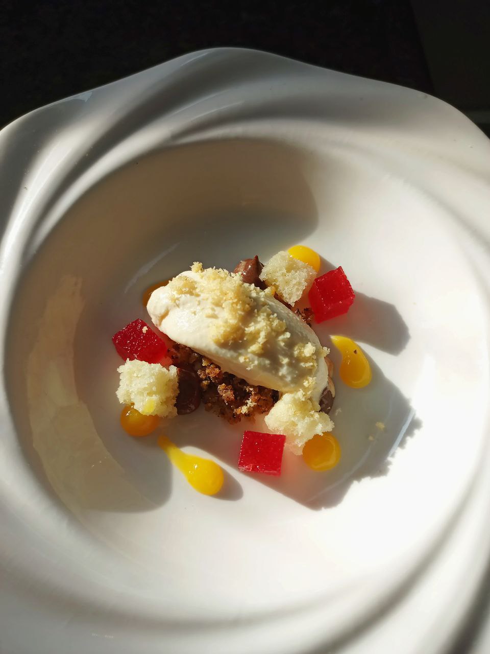 El gelato lo colocamos en forma de quenelle cuidadosamente sobre el crumble y finalmente terminamos con un poco de coco deshidratado sobre nuestro gelato.