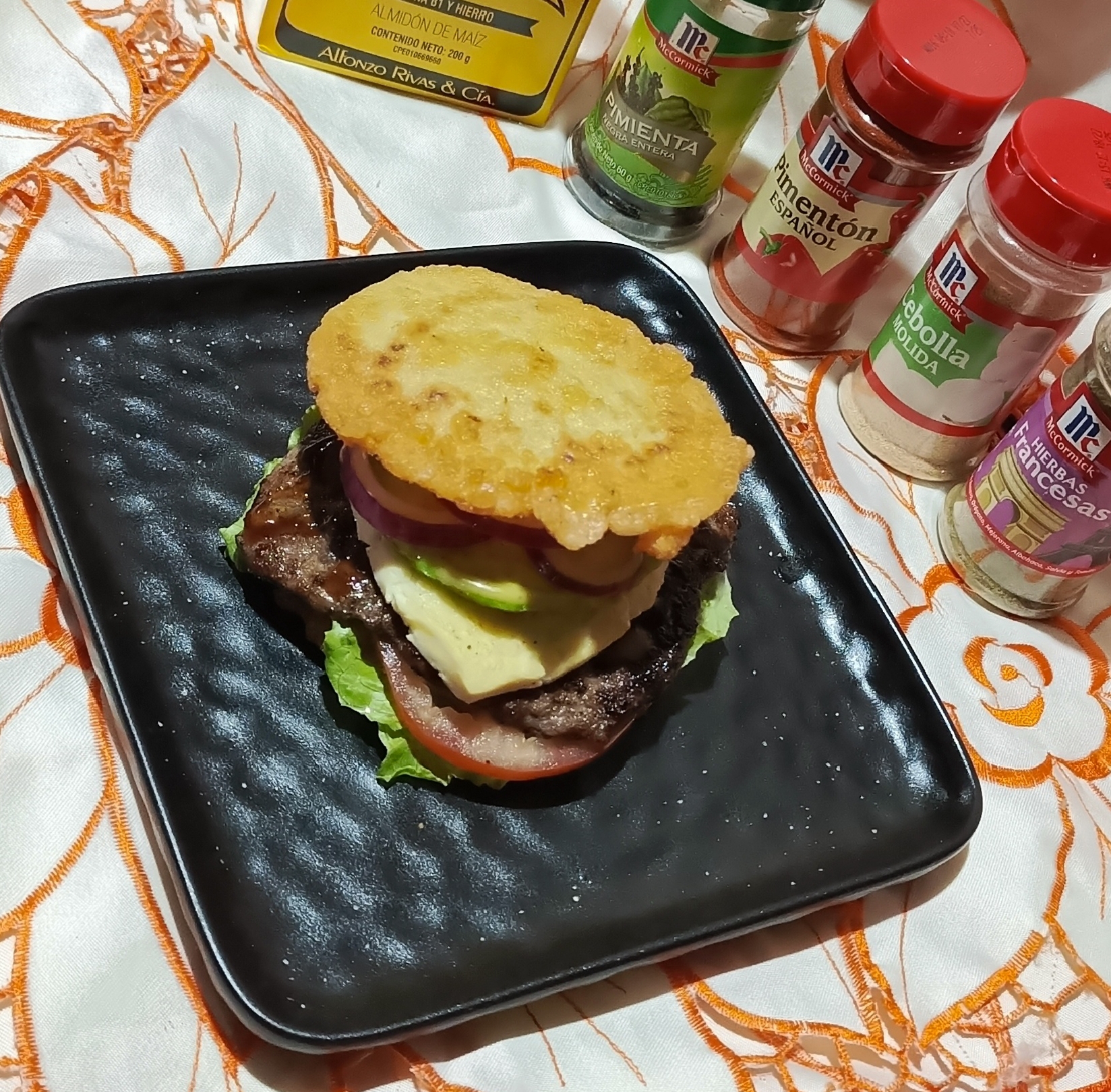 1) prepara las arepas y pásalas por un budare o plancha para sellar por ambos lados, una ves listas retira y dejamos enfriar.2) Aparte, preparamos una marinada seca con: pimienta, sal, cebolla molida, pimentón en polvo, hiervas francesas (McCormick) y ajo majado, sazonamos los bistecs y dejamos reposar..