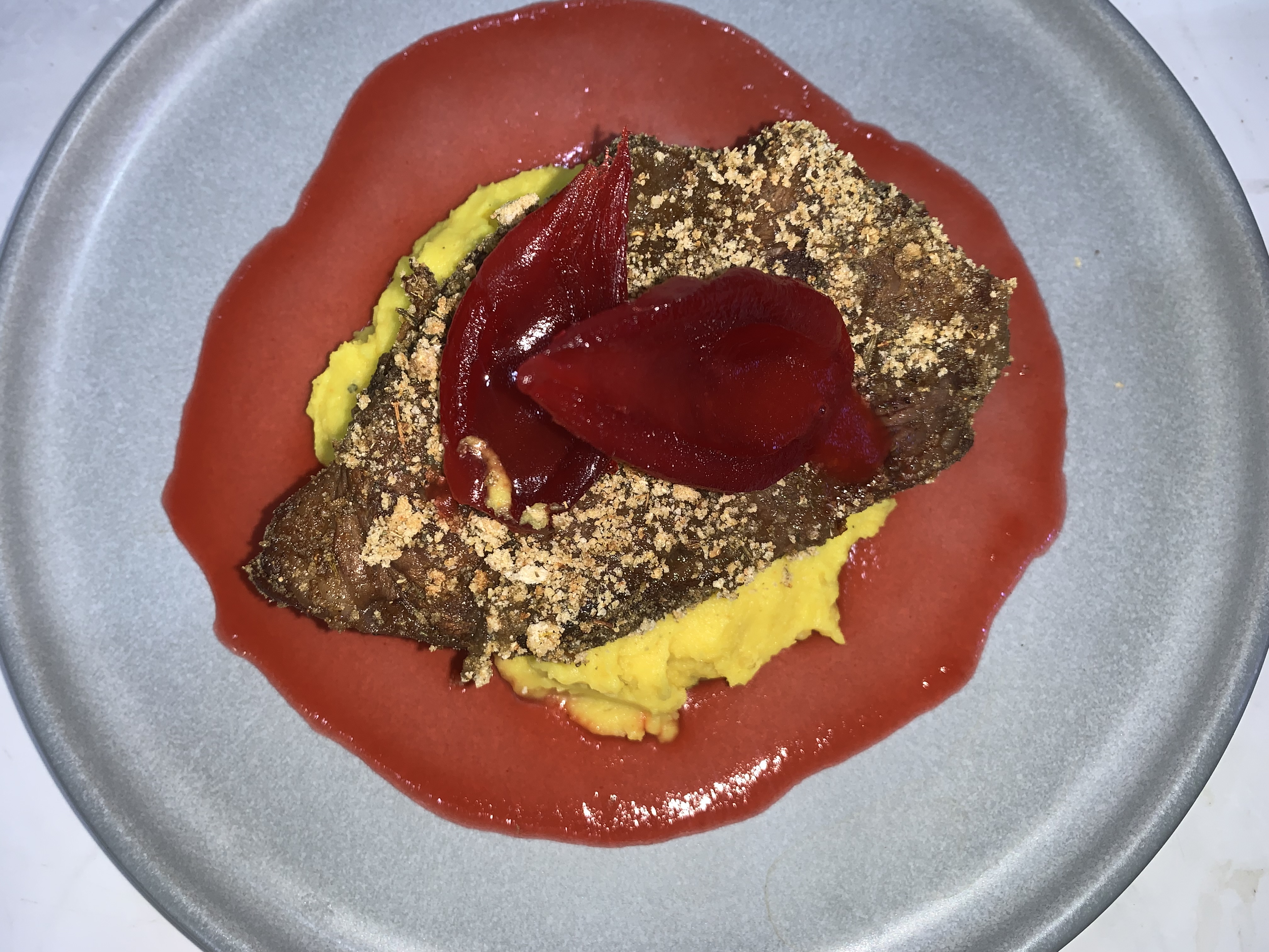 Comenzamos macerado el chivo por 35min, con sal rosa, azúcar morena y vino tinto, luego lo sellamos por ambos lados aproximadamente 2 minutos por cada lado. Luego encasabar por ambos lados con casabe molido, orégano, pimienta negra (McCormick) ají jobito, cayena y sal rosa, lo llevamos al horno por 40min a 150 grados.Para el puré escalfe las papas y el apio, luego de algunos minutos retiro de la estufa, y comienzo a hacer el puré con papas, Maizina Americana y mantequilla, luego lo tamice y le agregue una mantequilla aromitizada con cúrcuma McCormick.