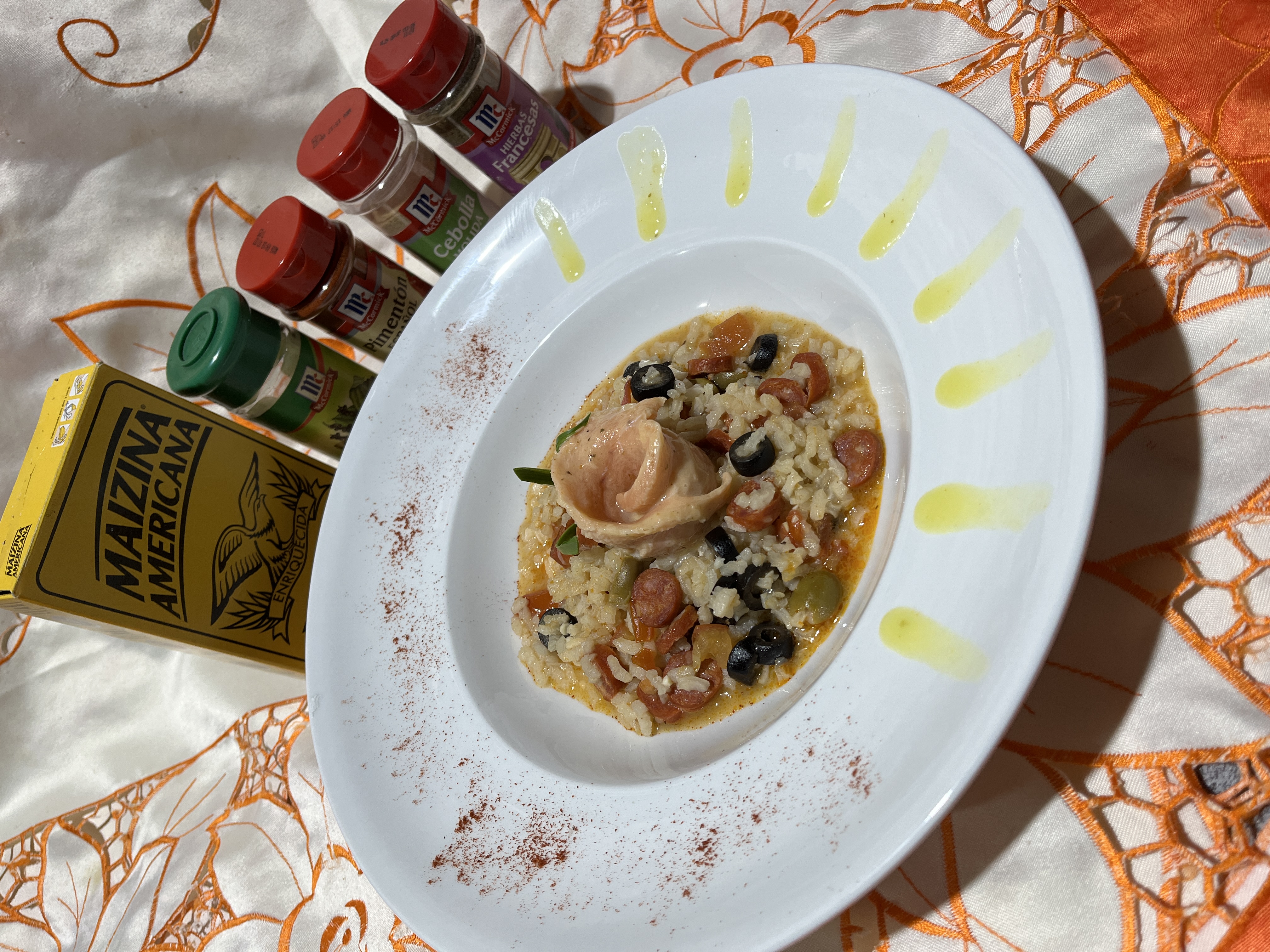 Paso3: Coloque a precalentar la cacerola y vertí dos cucharadas de aceite de oliva y sofreí primeramente la Chistorra para extraer su sabor y luego agregamos el ajo y la cebolla hasta llegar a cristalizarla, vertí los tomates le agregué las especias McCormick que fueron: Pimentón español, pimienta negra, cebolla en polvo y hierbas francesas y de ahí partí a colocar el arroz alborio sofreí hasta integrar todo los sabores fui agregando el liquido, dejando así cocer bajo fuego lento hasta el punto donde le coloque el vino