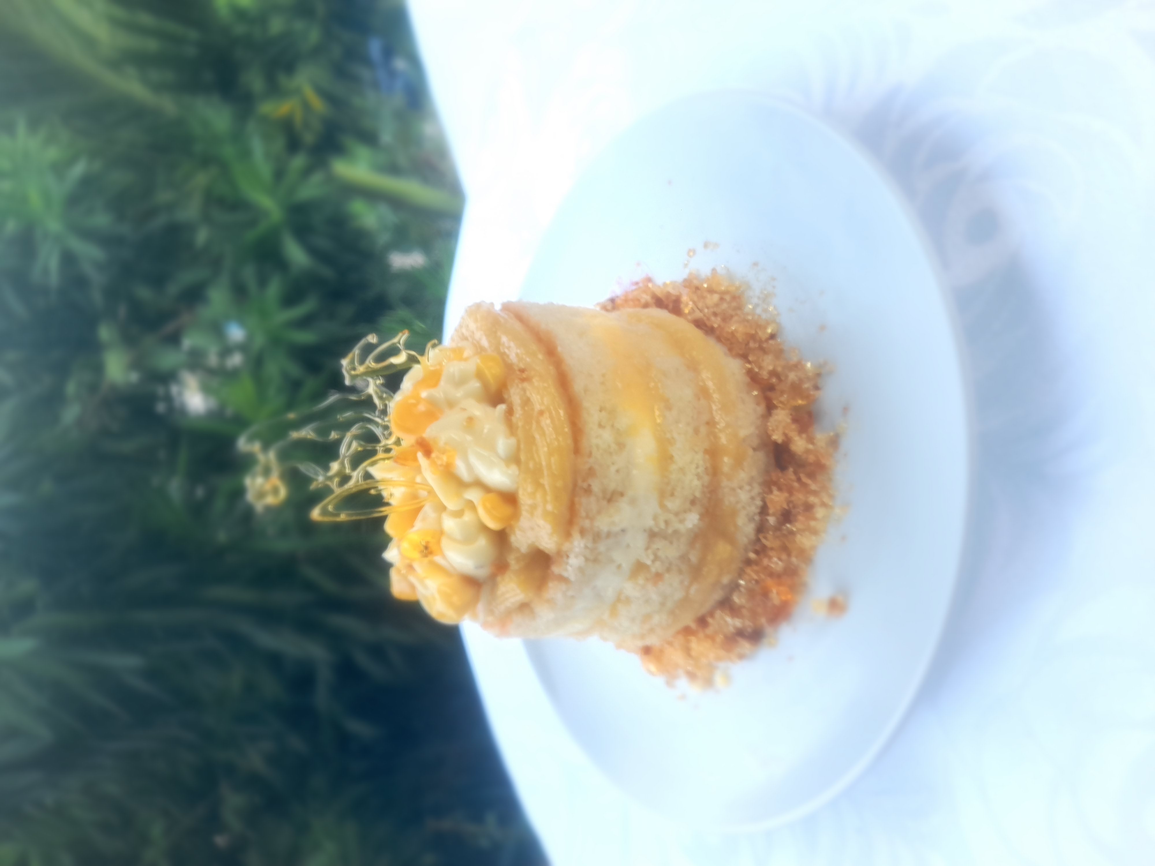 Forma de armado: utilizar un cortador circular para porcionar el Bizcocho, haciendo 12 discos para las 4 porciones, cada una de las porciones requieren 3 discos de Bizcocho, humedecer con el almibar, luego rellenar la primera capa con la compota de jojoto, colocar encima el segundo disco previamente humedecido con el almibar, colocar una capa de la crema pastelera con queso crema y colocar el tercer disco de Bizcocho. encima colocar compota de jojoto y crema, decorar con el caramelo, el praline y los granos de jojoto