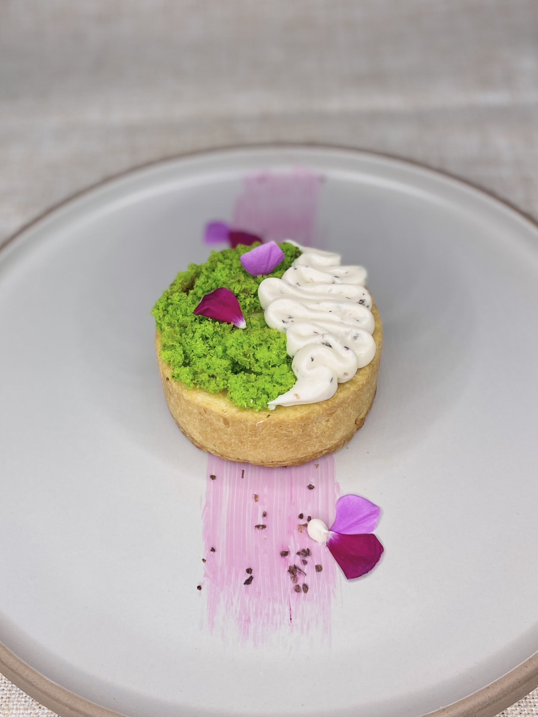 Emplatado: En un envase pequeño, colocar el Ganache que reservamos previamente y agregarle 1 gota de colorante rosa. Mezclar bien y con una brocha o pincel, hacer una pincelada vertical en el plato. Poner en el centro del plato la base de masa sablée, colocar la crema de Limón y albahaca en una manga pastelera y rellenar la base de masa sablée de manera uniforme. Desmenuzar el musgo comestible y colocar algunos trozos en la parte izquierda del postre. Colocar el Ganache de chocolate y albahaca en una manga pastelera y decorar en forma de zigzag en la parte derecha del postre. Para finalizar, coloca algunos pétalos en el postre y en el plato a tu gusto.