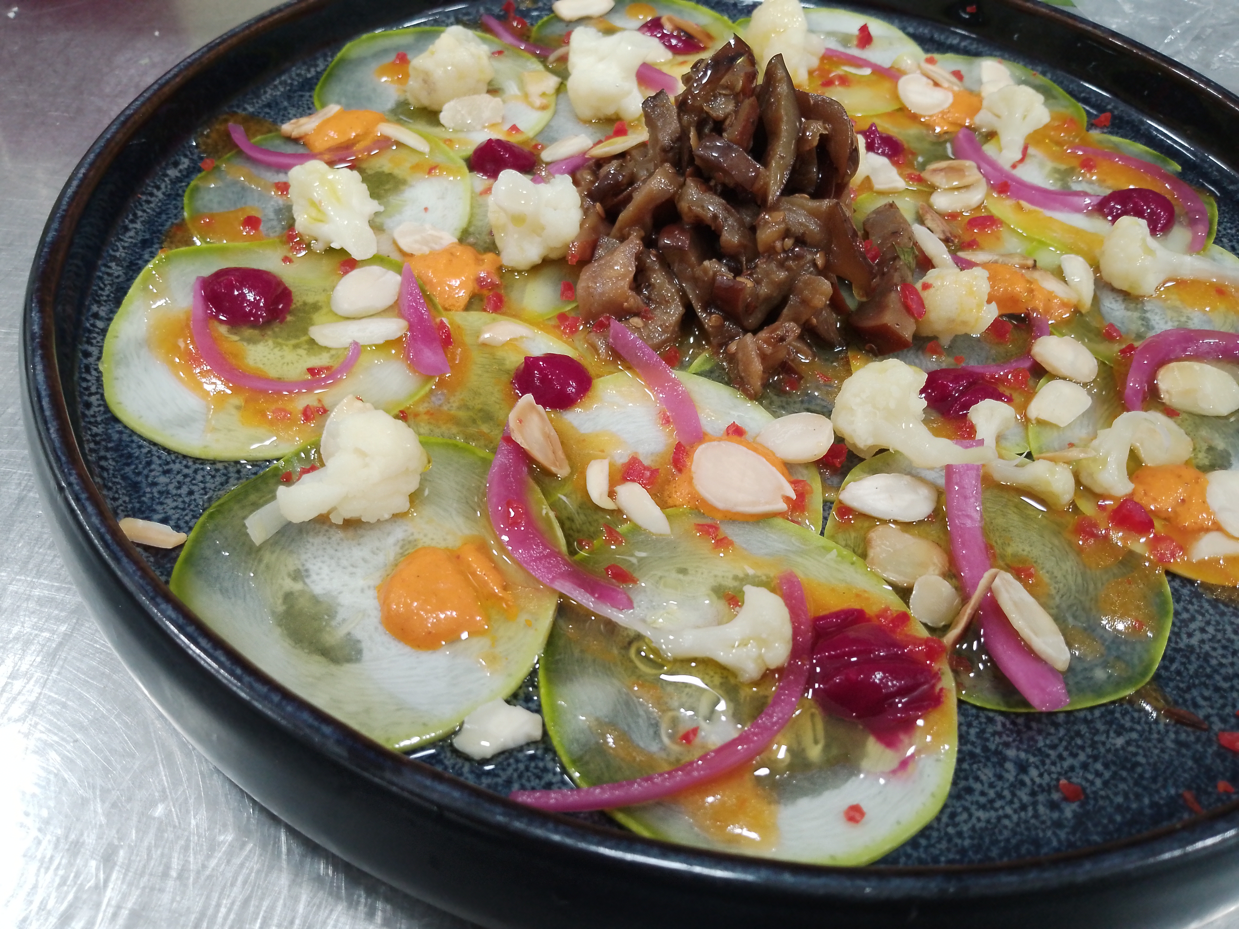 Rebanar calabacín en láminas finas y colocar en la base del plato bañar con la vinagreta y expandir con una brocha para luego agregar las cebollas encurtidas el brócoli y esparcir de forma uniforme sobre el calabacín y agregar la berenjena al centro del plato colocar pequeños suspiros de pasta de ají y humus de remolacha en forma de anillos intercalados y coronar con las almendras fileteadas y una pequeña pizca de aceite de oliva alrededor del plato