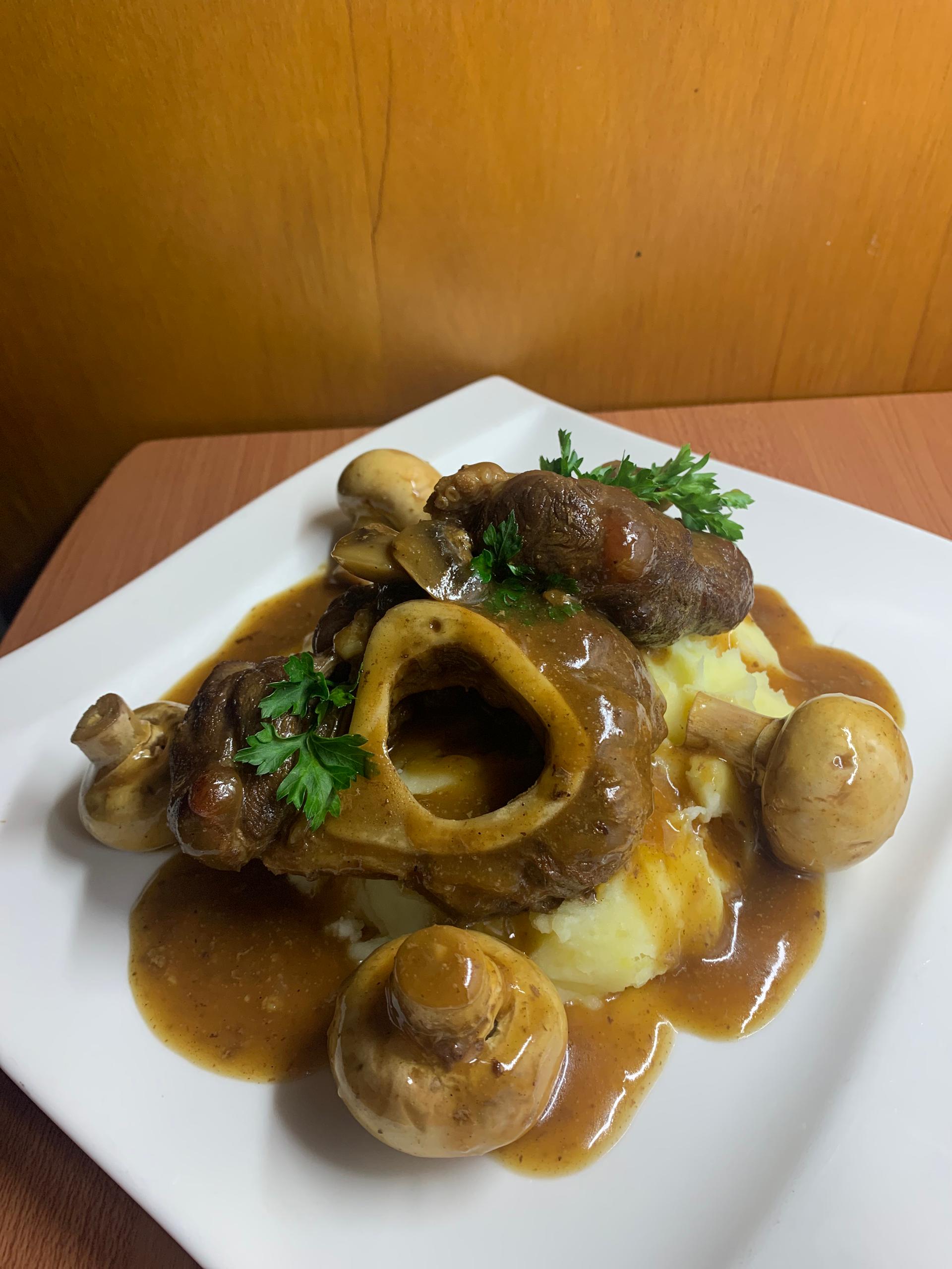 12) Se emplata dos medallones de osobuco acompañado de puré de papa