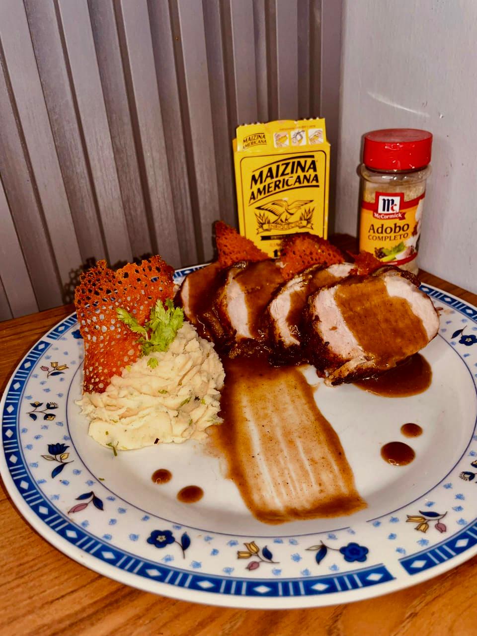 Solomillo de cerdo glaseado (tamarindo) con puré de papa ahumado.