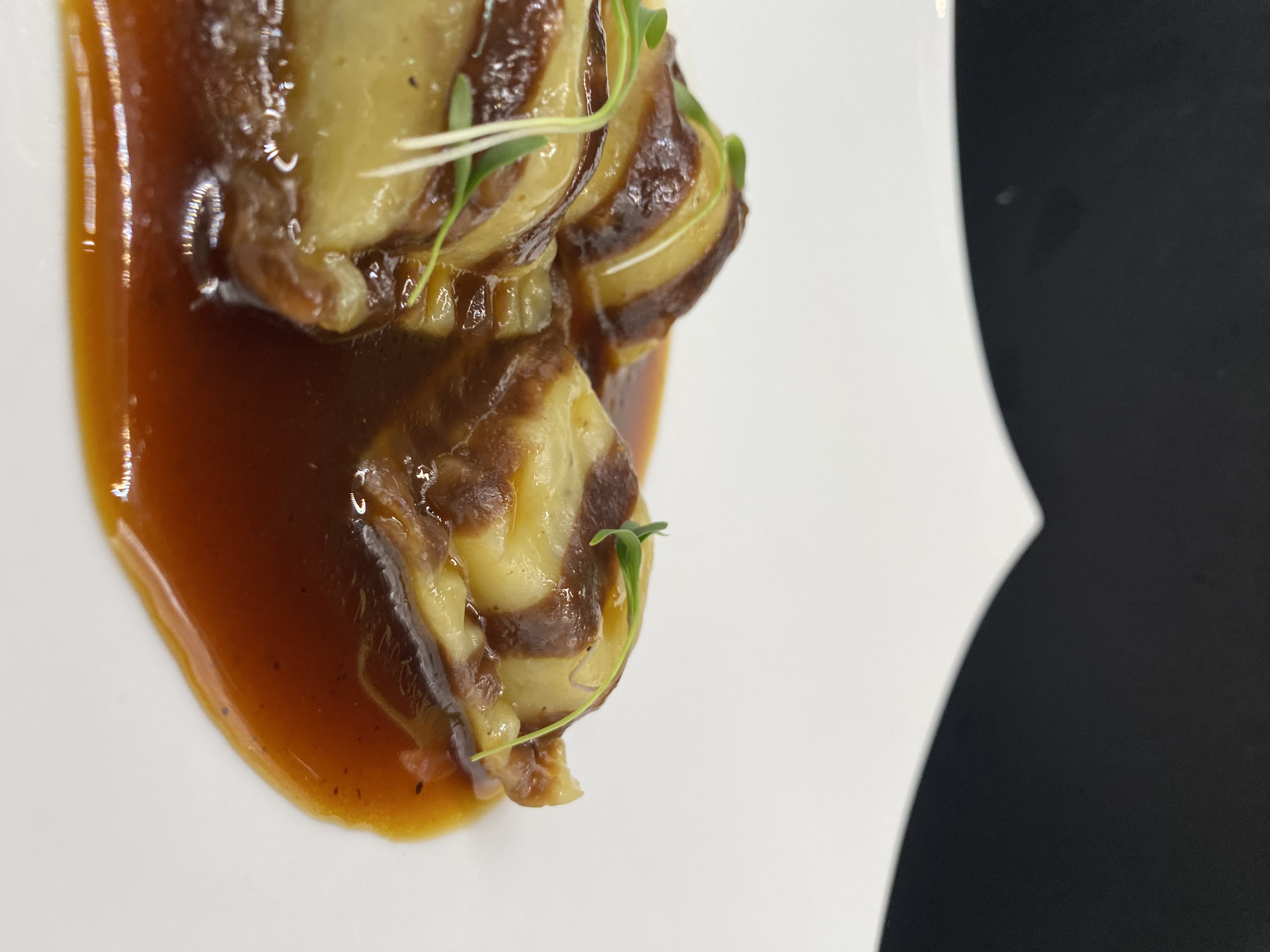 Para la salsa, sofrío cebolla y ají en aceite, añado fondo y papelón y dejo reducir ligeramente. Paso la preparación por un colador y luego incorporo vinagre de cacao, sal, pimienta negra McCormick, salsa inglesa McCormick y maple McCormick, ajustando los sabores hasta lograr un equilibrio perfecto. Finalmente, relleno las masas estiradas con la preparación de cerdo, cerrando y sellando cuidadosamente, listas para la cocción o presentación deseada y decoro.