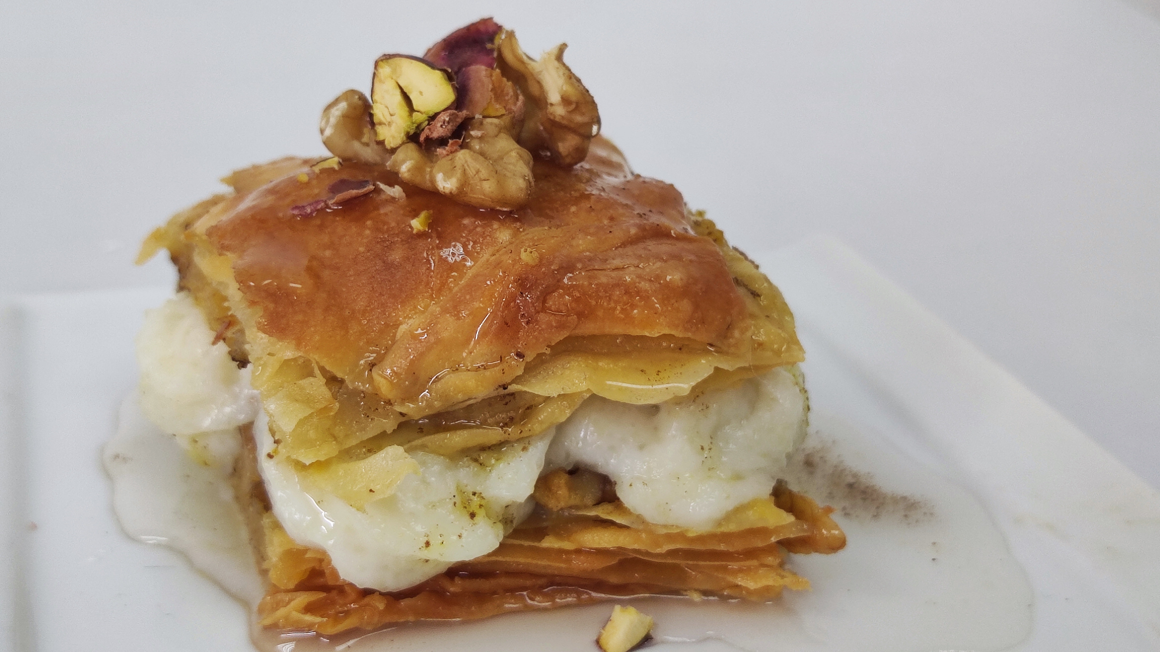 Seguidamente quitar la tapa superior del postre (todas las capas de masa filo) y colocar el kastha con una manga y boquilla sobre el relleno de nueces, luego colocar nuevamente la parte superior del postre.