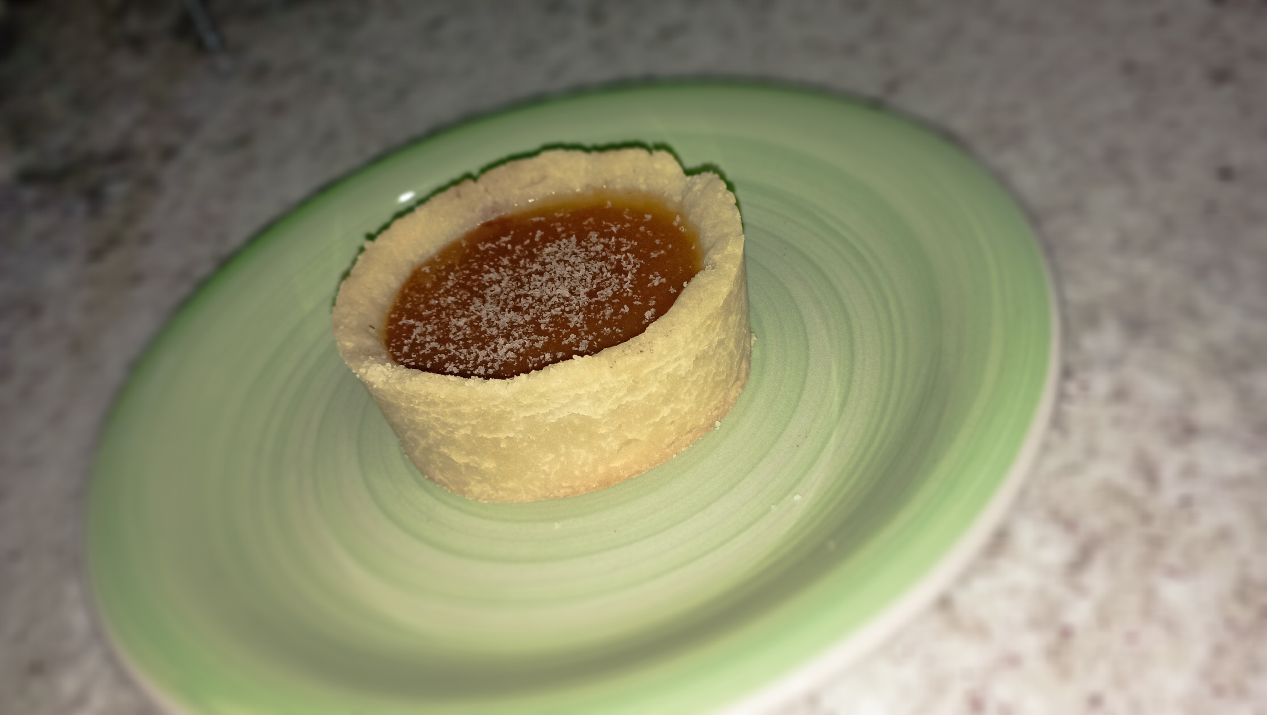 Colocamos la masa o base de las tartaletas, servimos nuestro relleno de caraotas con chocolate y finalizamos con el coulis picante por encima.