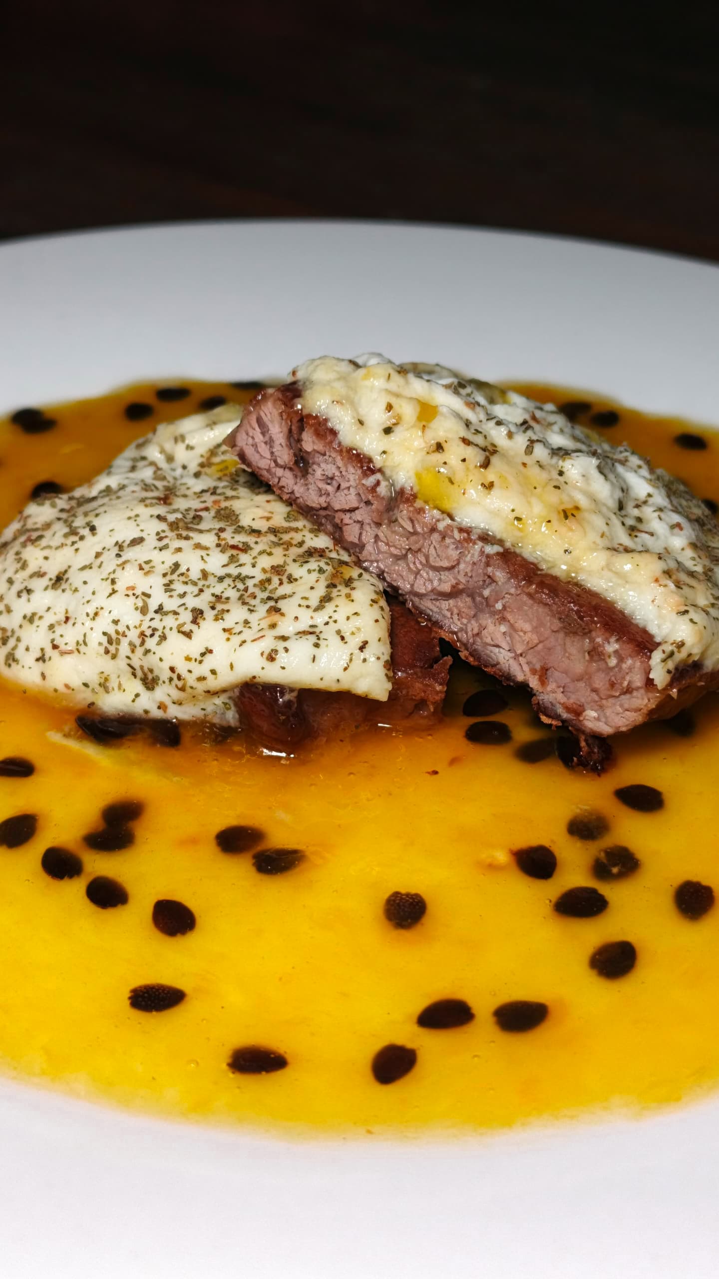 Solomo flameado al Cocuy con velo de queso telita y espejo de parchita