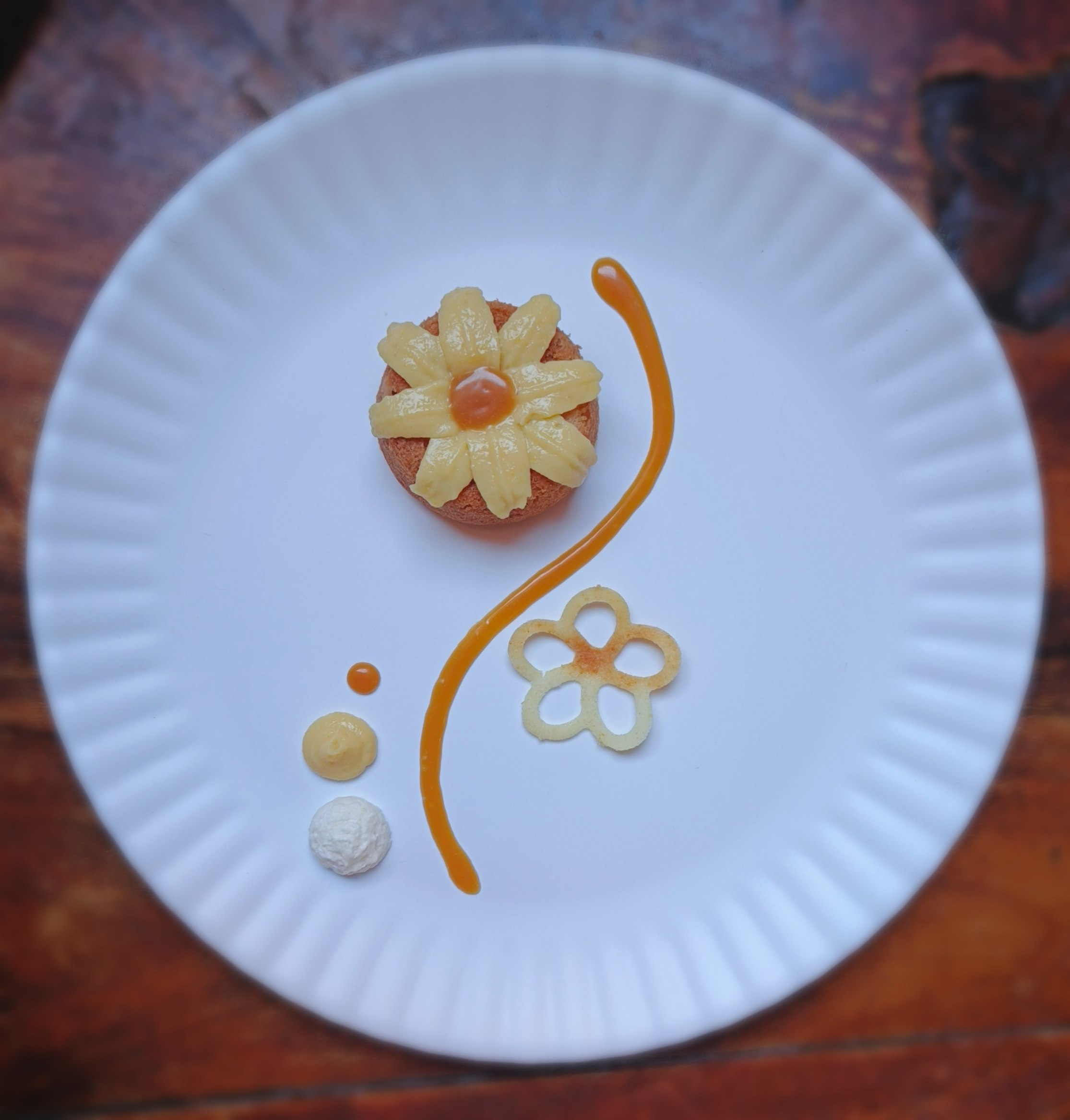Al momento de emplatar tomar una porción de ponqué y ahuecar el centro para rellenar el mismo con el mousse de ricota y caramelo salado.