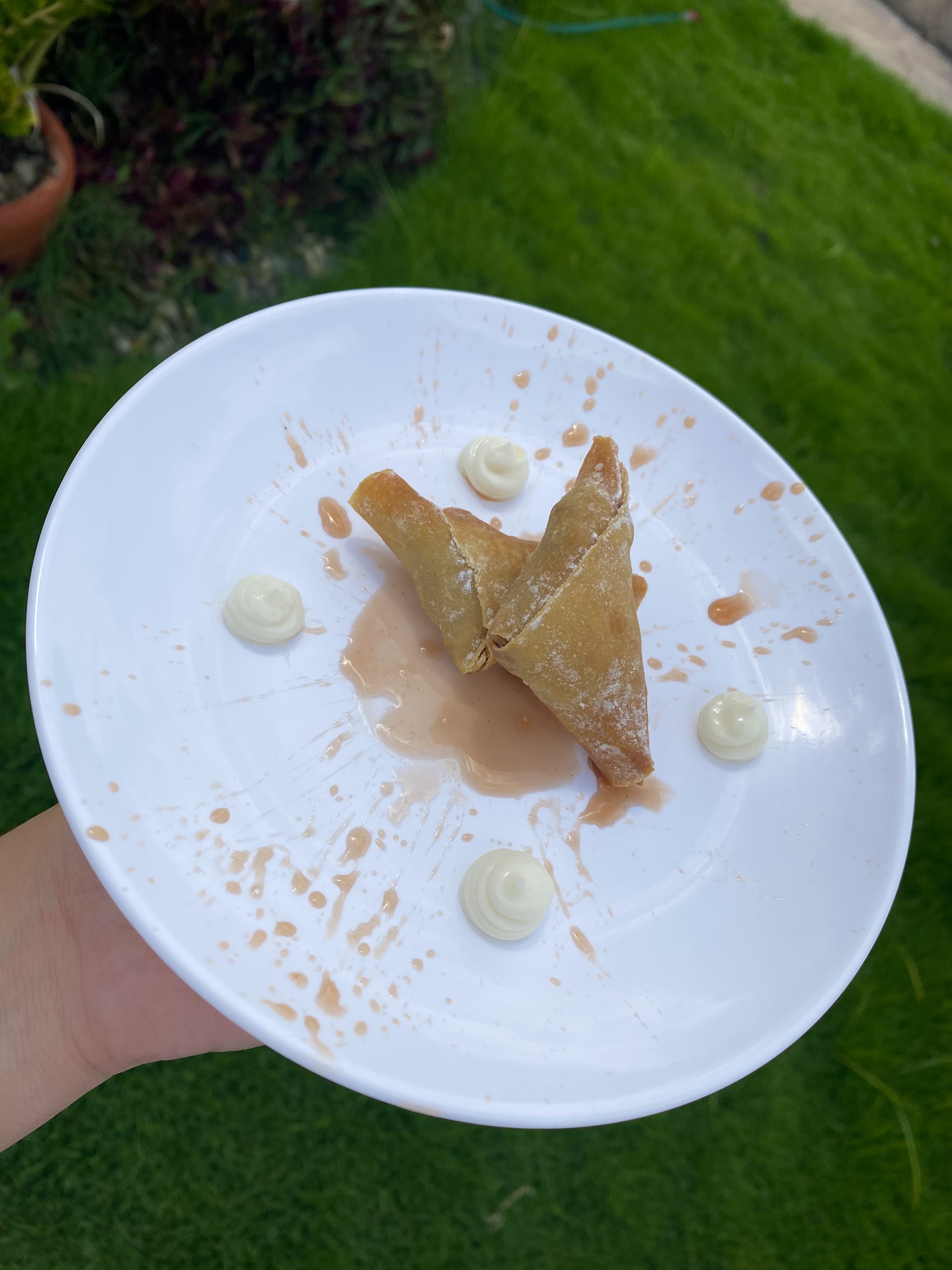 8. Cortar tiras de masa filo de aproximadamente 6cm de ancho, pincelar con una mezcla de la mantequilla derretida y canela en polvo McCormick, tomar una porción de las peras y añadir en uno de los extremos para doblar formando un triángulo, repetir el proceso con el resto.
