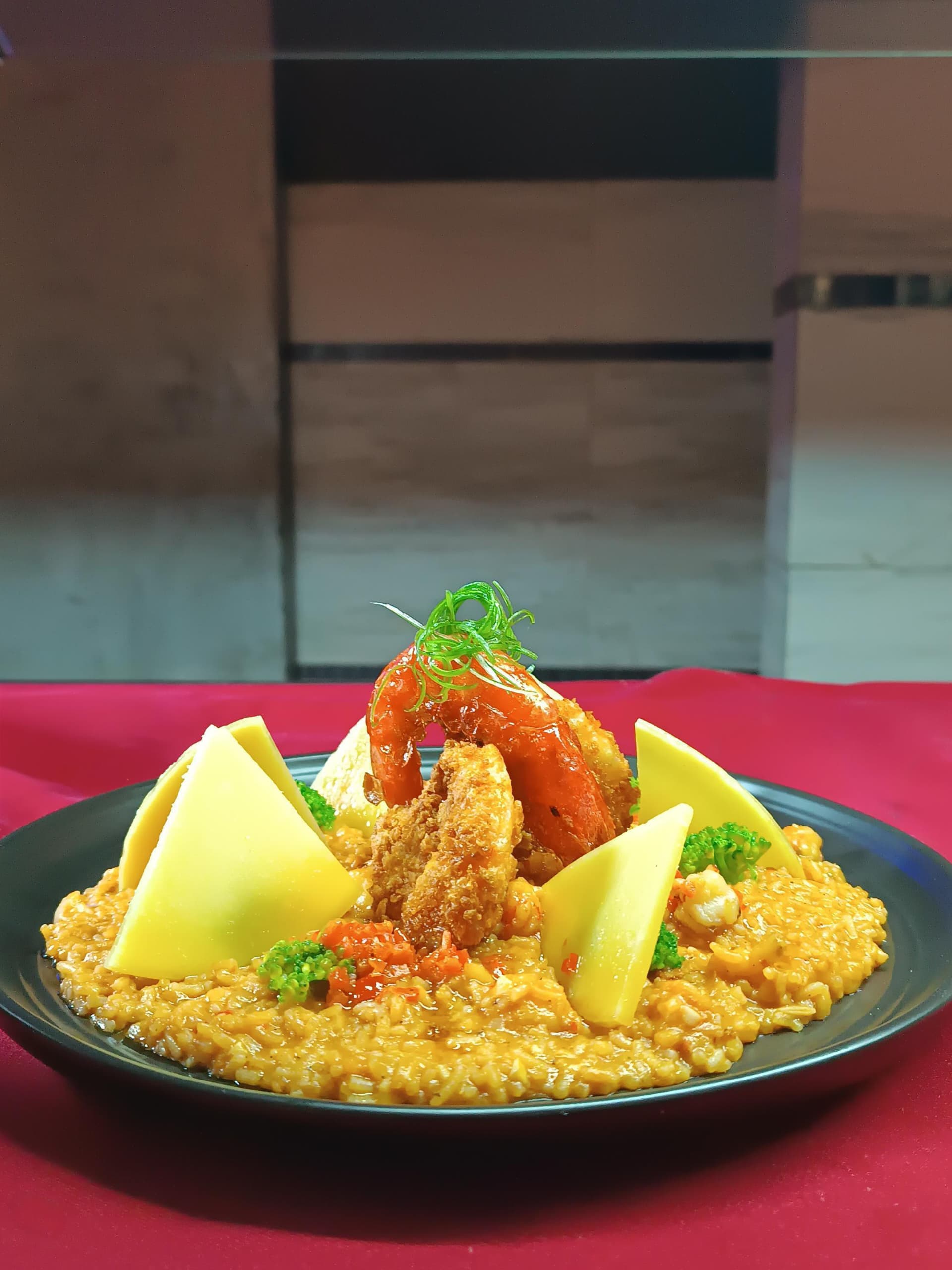 2- Agregamos en nuestro sartén aceite al estar caliente incorporamos ajo, cebolla removemos y colocamos 2 ajíes y la pasta de ajíes. Flambeamos, removemos y colocamos nuestro arroz, mezclamos y agregamos el bisquets nuevamente volvemos a mezclar, repetimos por varias veces y vamos verificando el sabor, colocamos los langostinos y le agregamos el queso removemos y al final le agregamos la mantequilla para darle brillo.
