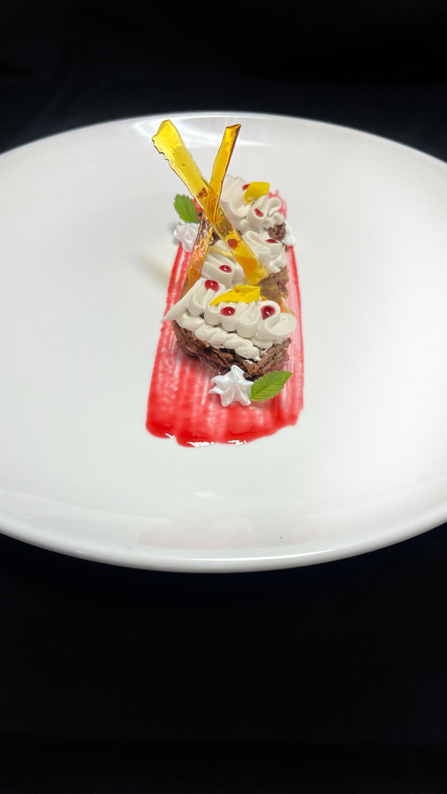 BizcochoPrimero se coloca a fundir el chocolate junto a la mantequilla a baño maría, una vez fundido se retira del fuego e incorporamos la harina de almendra con la fecula de maiz y 2 yemas de huevos, se remueve hasta incorporar todos los ingredientes, en un bowl aparte se bate claras de 2 huevos junto con azúcar glass, se integra la mezcla del bizcocho a las claras de huevo y se incorporan los ingredientes hasta obtener una mezcla homogénea, luego se extiende sobre un silpack de manera uniforme, el mismo se colocará sobre una bandeja y se llevará a hornear a una temperatura de 160 ºC durante 10 minutos e ir rectificando de que el bizcocho esté listo. Al finalizar, se saca del horno y se deja reposar a temperatura ambiente