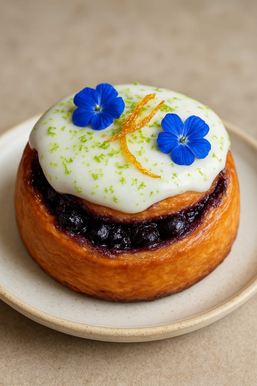 Una vez glaseado, se decora con delicados pétalos de clitoria (o flor de guisante de mariposa), cuyas tonalidades azules y moradas aportan un contraste de color fascinante. Para un toque crujiente y dulce, se finaliza con ralladura de lima caramelizada, que se prepara salteando la ralladura de lima con un poco de azúcar hasta que se dore ligeramente.