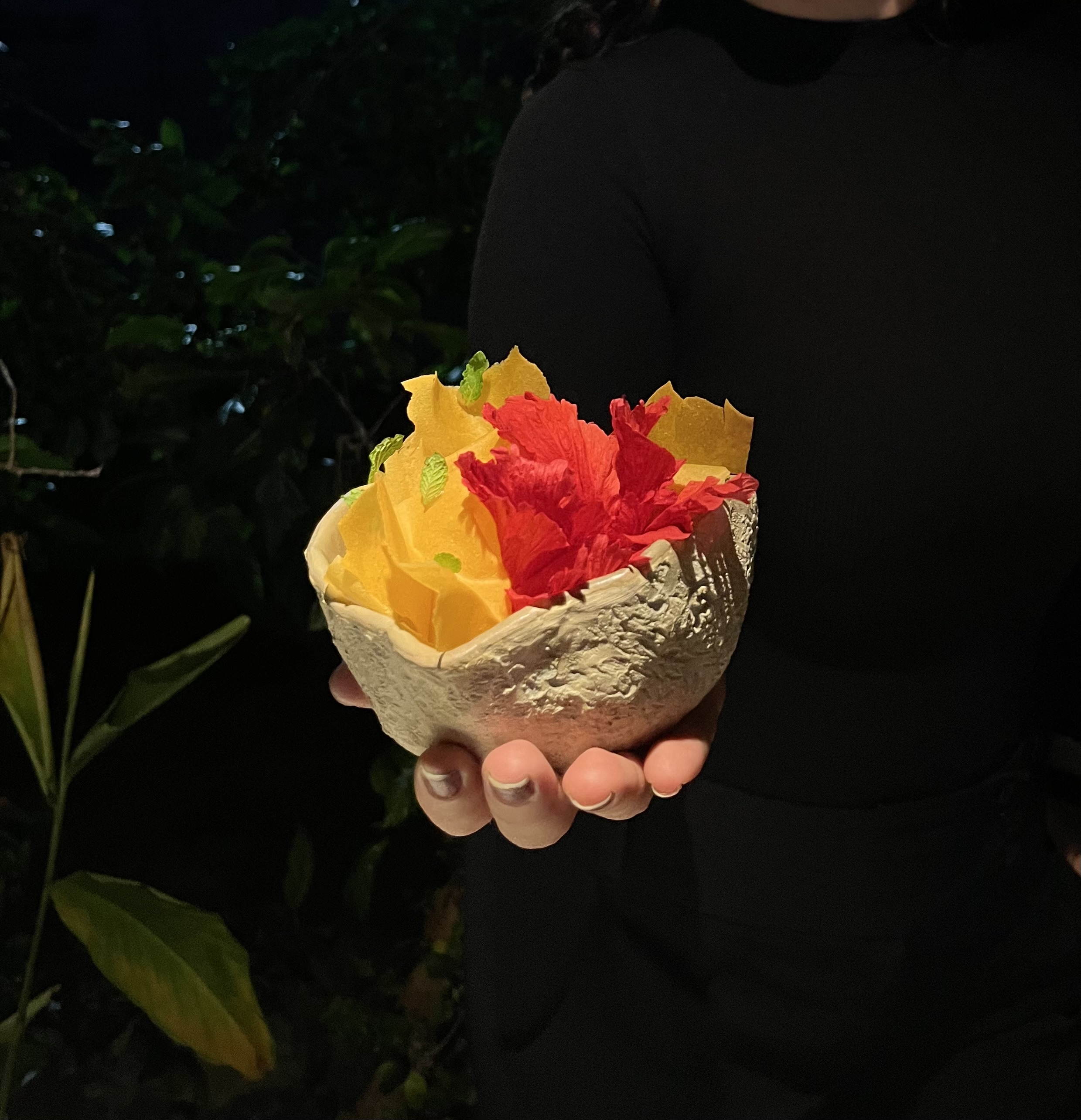 5. intercalar encima los tuille de batata con los pétalos de cayena.