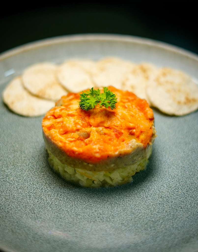 Tartar del huerto: Tartar de chayote con crema ahumada de berenjena y fondue de tomate al parmesano