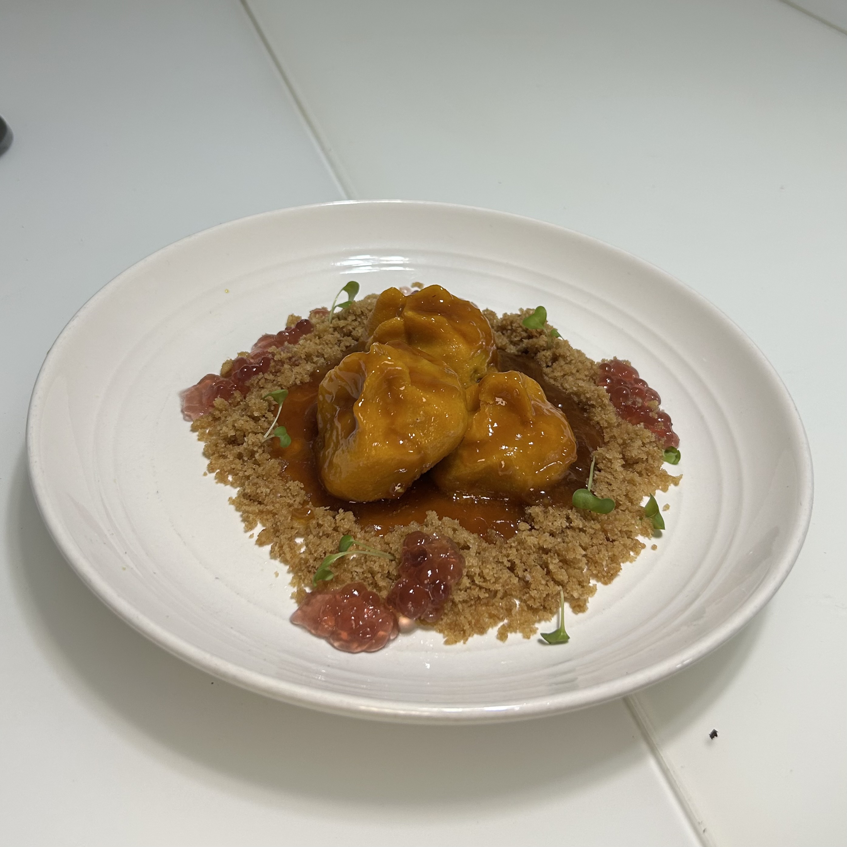 - Elemento Central: Llenar el centro del anillo de panko con una porción de la reduccion de parchita y jengibre. Colocar los dumplings de salmón dorados sobre la salsa.