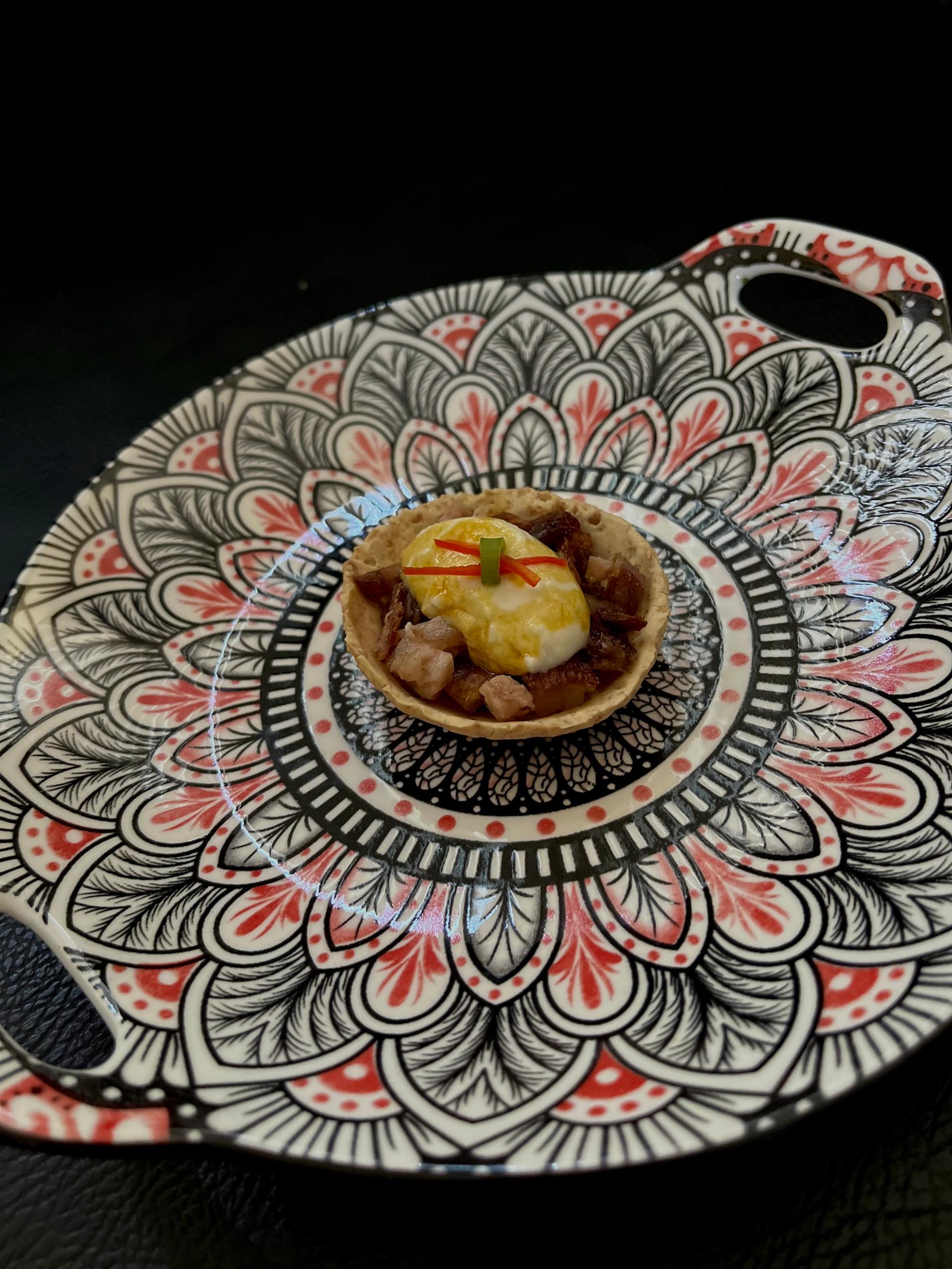 Para el montaje, se usa como base una tierra de maní triturado. Se coloca la galleta de maní, se rellena con el pork belly, se corona con el cremoso de queso guayanés y se baña con la salsa de miel de maple y mostaza picante. Como decoración se puede añadir cebollín y pimentón finamente picado.