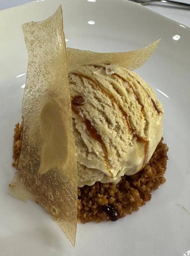 1. Con un aro sinfín, agregar una cucharada pequeña de crumble como base,