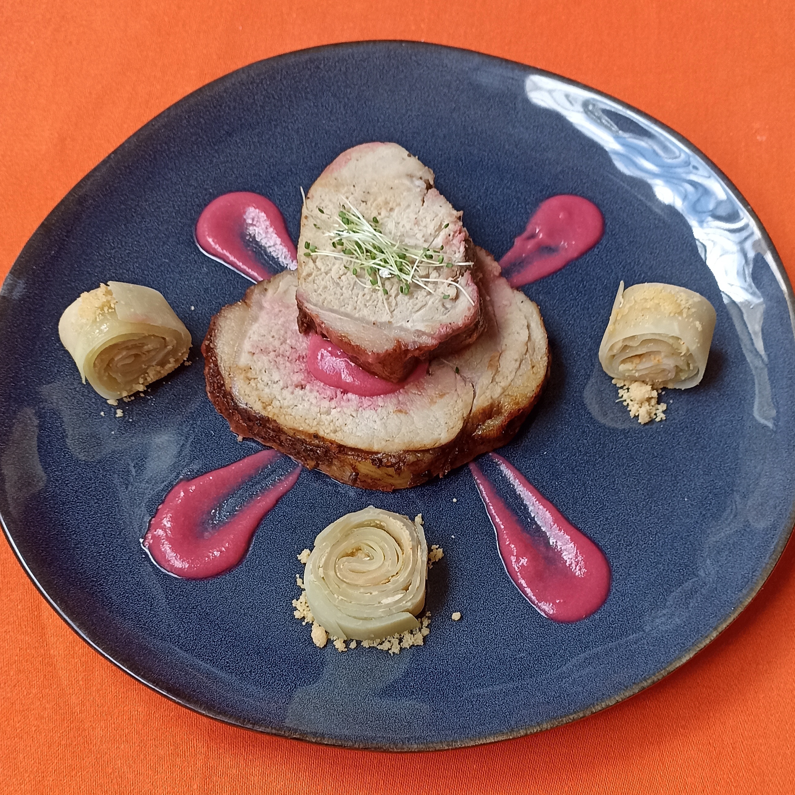 Lomo de Cerdo Dulce con Salsa de Remolacha y Manzanas.