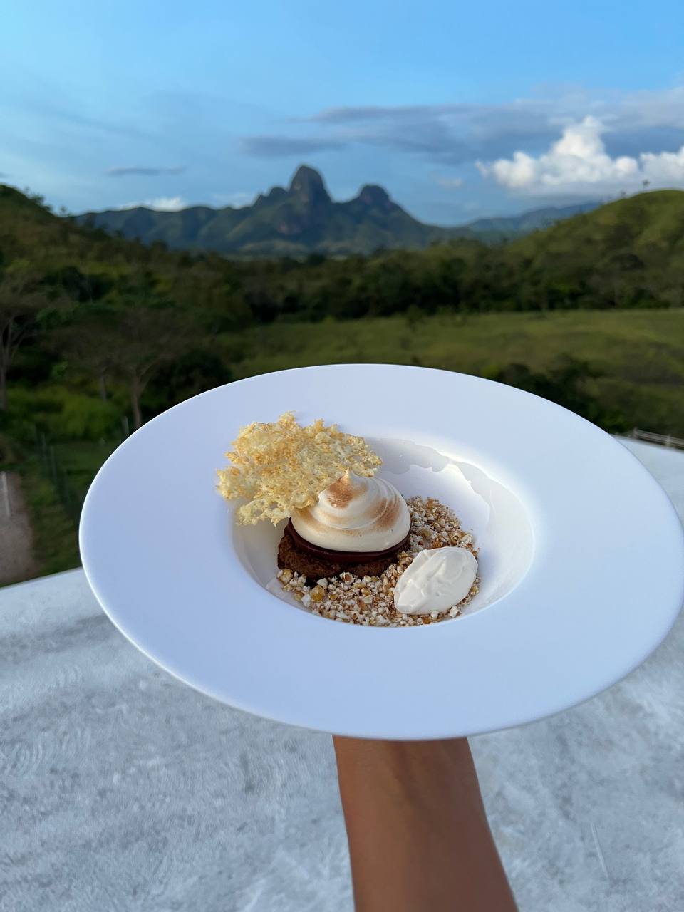 Quinto, ubicar el crujiente de queso encima del suspiro flameado apoyado al borde del plato.