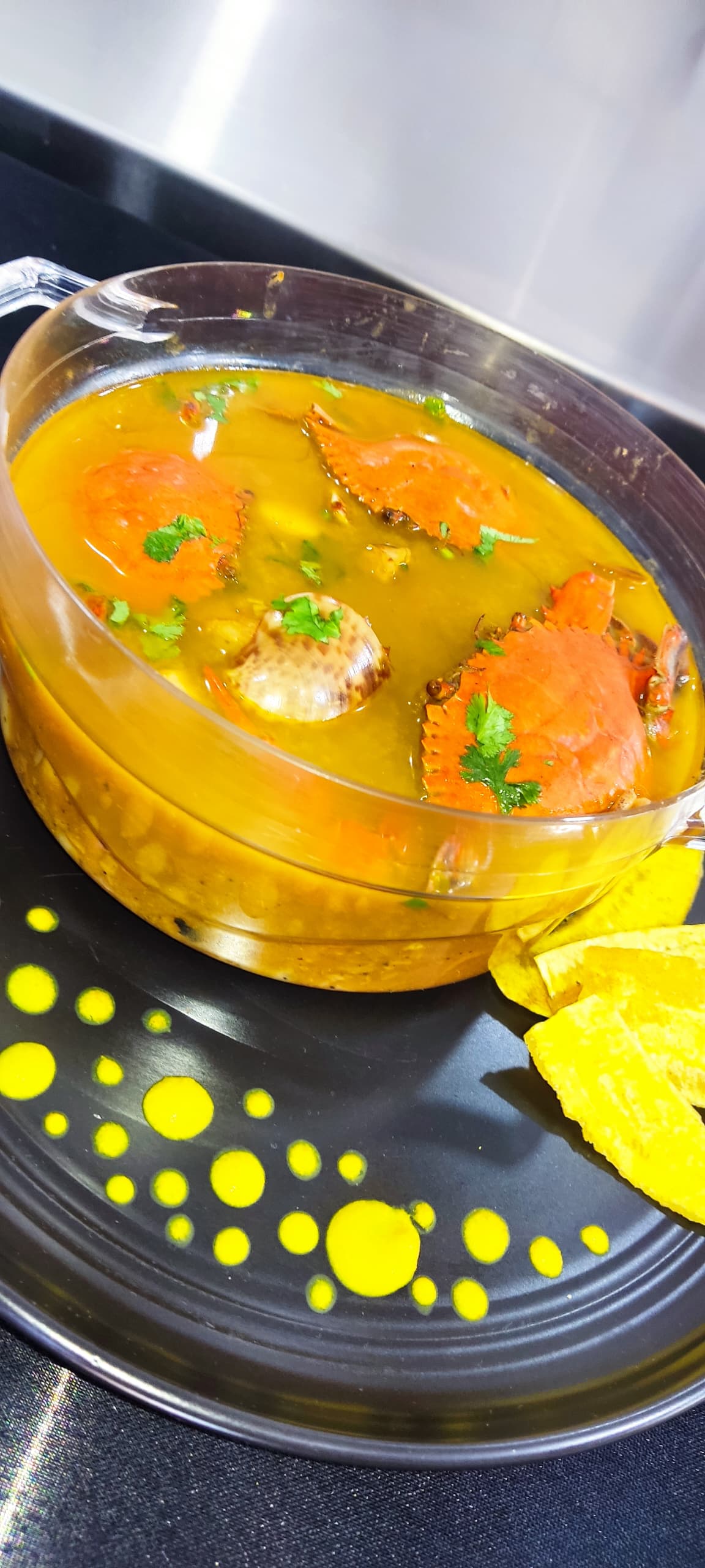 - En una olla se agregan los mariscos, el caldo de crustáceos, caldo de pescado, passata de tomate, maizina Americana y cocinar todo en conjunto durante aproximadamente 10 o 15 minutos y servir.